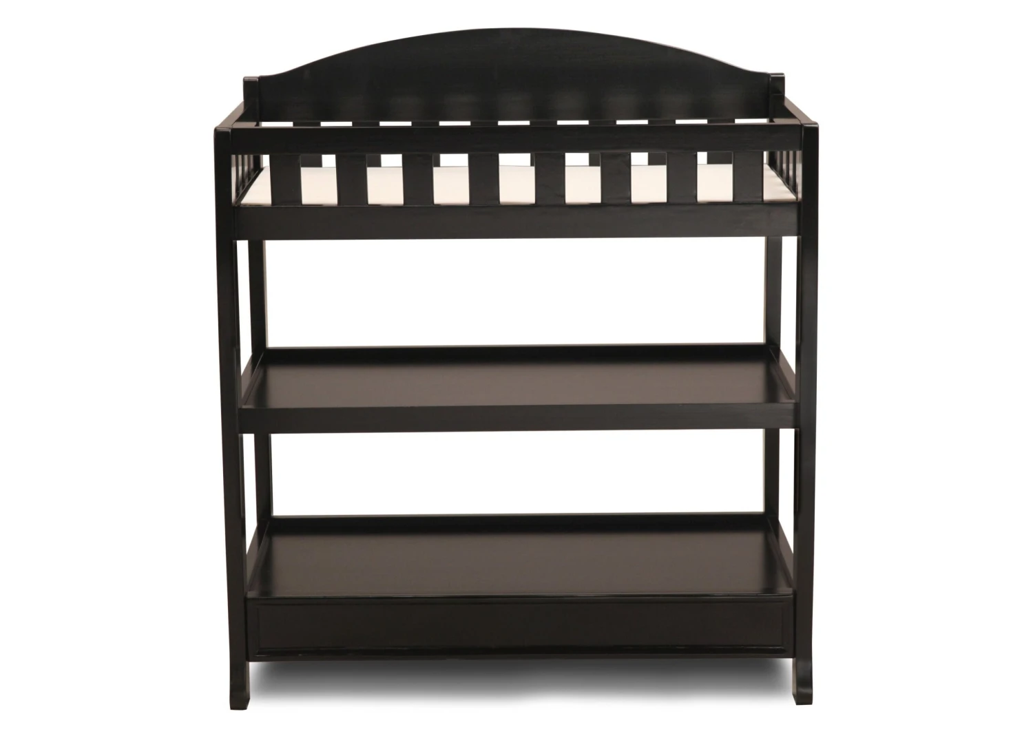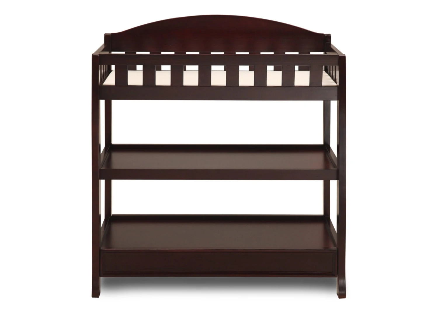 Change or dress your baby in absolute comfort with the Wilmington Changing Table by Delta Children. Designed with a timeless bell-shape silhouette and versatile features that make diaper changes easier, this changing table has two shelves that allow you to store your child’s changing and dressing necessities nearby. The included changing pad comes with an attached safety strap and is placed in a fully enclosed dressing area that provides extra security. The Wilmington Changing Table is available in several popular finishes and coordinates with many Delta Children cribs.